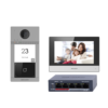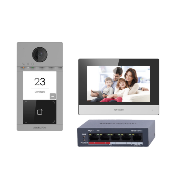 - Kit formado por: DS-KV8113-WME1(C) painel de entrada de vídeo de superfície para exterior com câmara de 2 Mpx HD DS-KH6320-WTE1, monitor interior WiFi com ecrã LCD TFT de 7″ e switch PoE standard